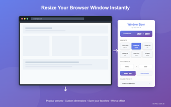 AIOによるWindow Sizerは、ウェブ開発およびデザイン目的のためにブラウザウィンドウのサイズ変更プロセスを簡素化するように設計されたChromeアドオンです。このツールは、ユーザーがブラウザウィンドウをフルHD、ラップトップ、タブレット、モバイルなどの人気のプリセットサイズに迅速に調整できるようにし、異なるデバイスでのレスポンシブテストに最適です。ユーザーはカスタム寸法を入力し、将来の使用のために独自のプリセットを保存することもでき、ワークフローの効率を向上させます。